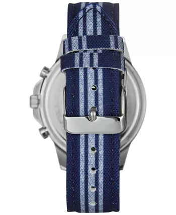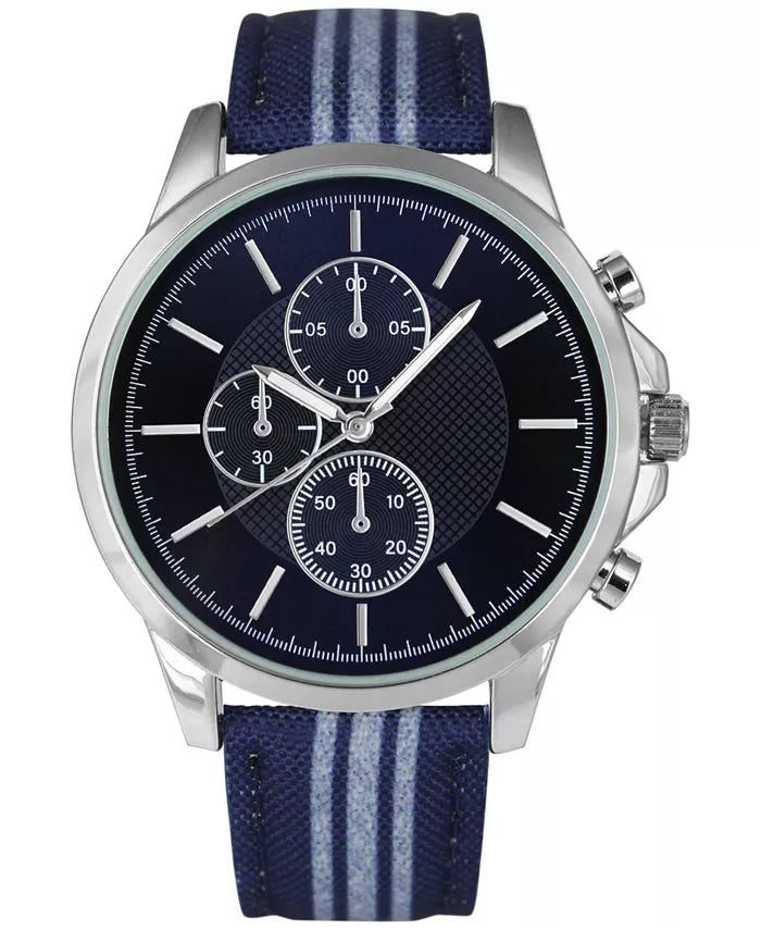A striped denim strap and imitation chronograph dial merge to create this sporty cool INC International Concepts® watch.